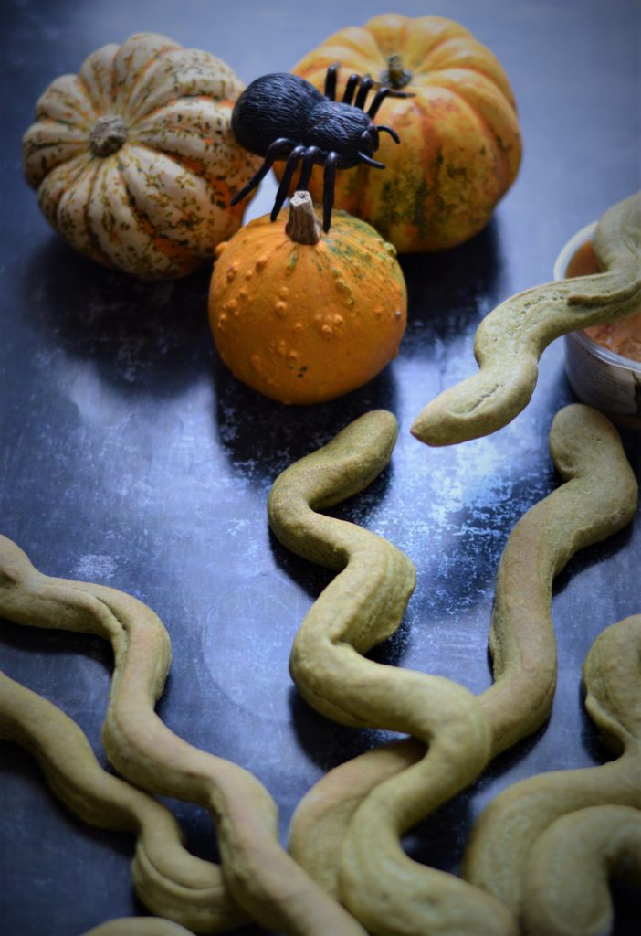 Men der skal jo også spises noget Halloween-guf! Og her har jeg så et forslag: spis Medusas hår i form af de her slange-lignende brødstænger. Selv om Halloween for mig plejer at være fyldt med alt det søde, jeg nu engang kan skrabe sammen og få lavet (græskartærte!), så det også godt med noget lidt mere mættende, der samtidig oser af Halloween. Så her er mit forslag til en lækker snack.
